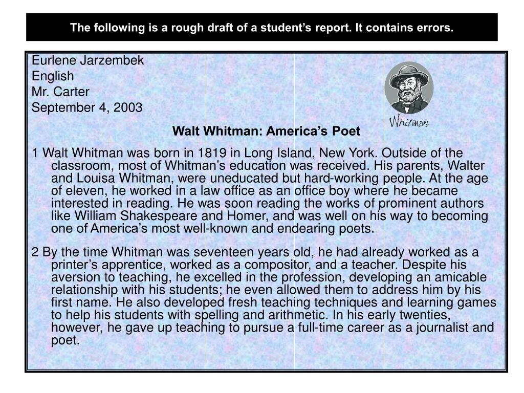 The following is a rough draft of a student’s report. It contains errors. Eurlene Jarzembek English Mr. Carter September 4, 2003 Walt Whitman: America’s Poet 1 Walt Whitman was born in 1819 in Long Island, New York. Outside of the classroom, most of Whitman’s education was received. His parents, Walter and Louisa Whitman, were uneducated but hard-working people. At the age of eleven, he worked in a law office as an office boy where he became interested in reading. He was soon reading the works of prominent authors like William Shakespeare and Homer, and was well on his way to becoming one of America’s most well-known and endearing poets. 2 By the time Whitman was seventeen years old, he had already worked as a printer’s apprentice, worked as a compositor, and a teacher. Despite his aversion to teaching, he excelled in the profession, developing an amicable relationship with his students; he even allowed them to address him by his first name. He also developed fresh teaching techniques and learning games to help his students with spelling and arithmetic. In his early twenties, however, he gave up teaching to pursue a full-time career as a journalist and poet.