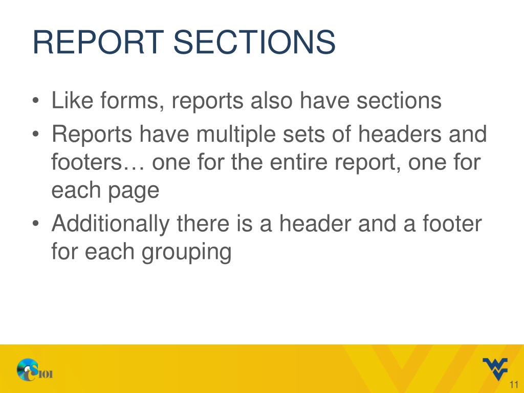 Report sections • Like forms, reports also have sections • Reports have multiple sets of headers and footers… one for the entire report, one for each page • Additionally there is a header and a footer for each grouping