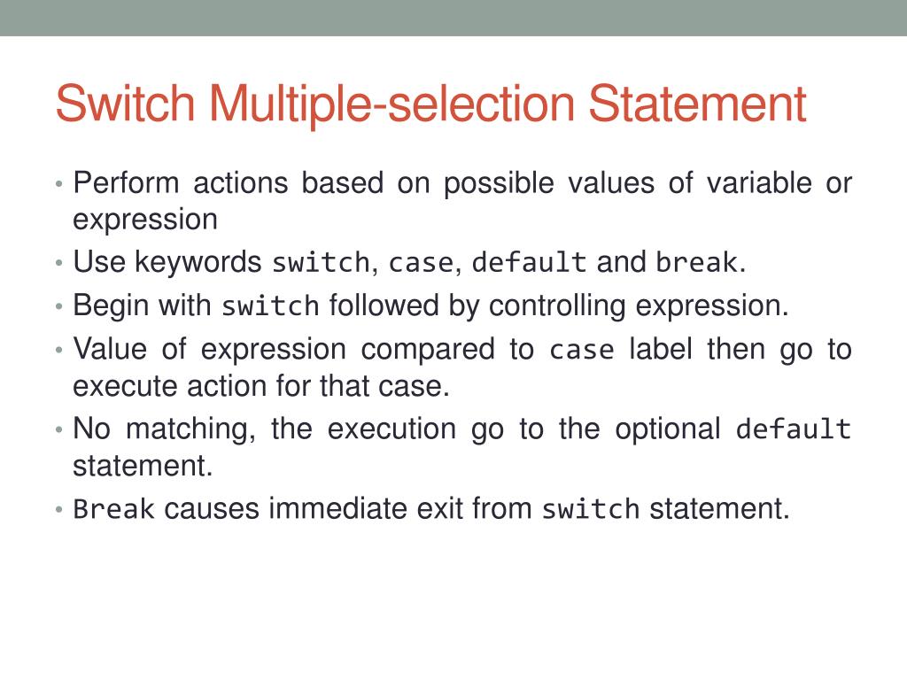 Switch Multiple-selection Statement • Perform actions based on possible values of variable or expression • Use keywords switch, case, default and break. • Begin with switch followed by controlling expression. • Value of expression compared to case label then go to execute action for that case. • No matching, the execution go to the optional default statement. • Break causes immediate exit from switch statement.