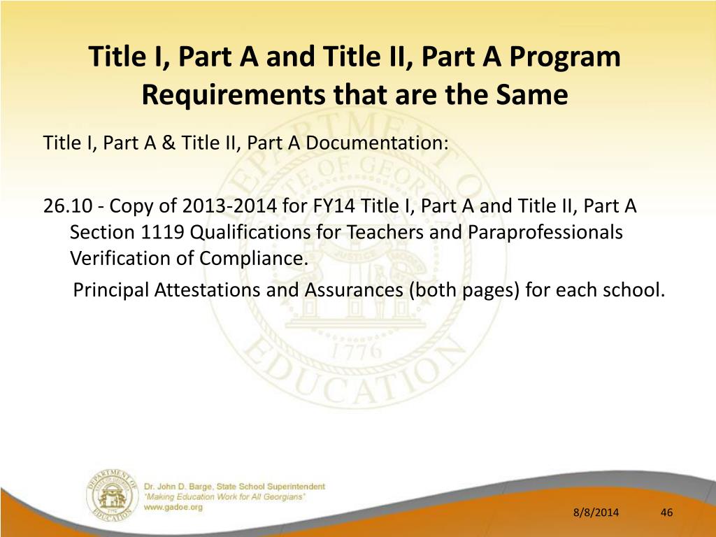 Title I, Part A and Title II, Part A Program Requirements that are the Same Title II, Part A Title I, Part A Required in Title I, Part A as well. Core is defined as Reading/Language arts, math, science and social studies. 26.6 100% of core academic content teachers and paraprofessionals are HiQ. Documentation: 26.6 - Copy of the Highly Qualified Teacher and Paraprofessional. Annual Percentage Data Report (GaPSC HiQ Report) for 2013-2014 for FY14.