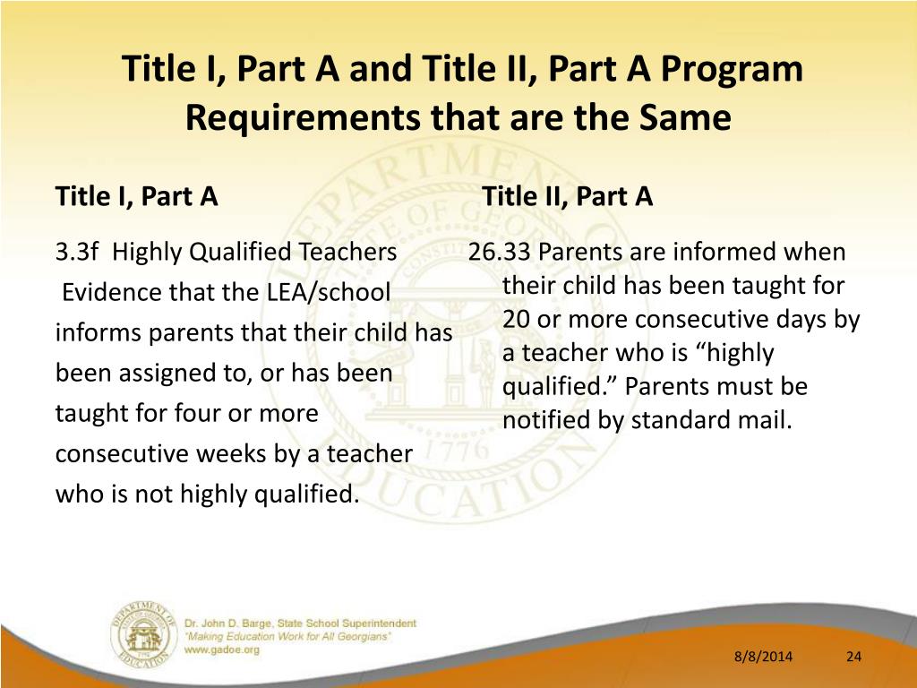 Title I, Part A and Title II, Part A Program Requirements that are the Same Title I, Part A Title II, Part A 26.33 Parents are informed when their child has been taught for 20 or more consecutive days by a teacher who is “highly qualified.” Parents must be notified by standard mail. 3.3f Highly Qualified Teachers Evidence that the LEA/school informs parents that their child has been assigned to, or has been taught for four or more consecutive weeks by a teacher who is not highly qualified.