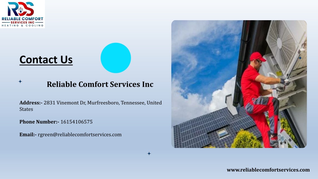 Contact Us Reliable Comfort Services Inc Address:- 2831 Vinemont Dr, Murfreesboro, Tennessee, United States Phone Number:- 16154106575 Email:- rgreen@reliablecomfortservices.com www.reliablecomfortservices.com