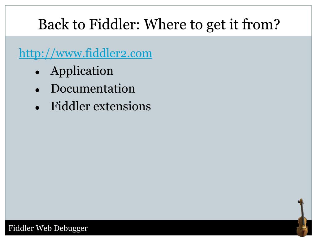 Back to Fiddler: Where to get it from? http://www.fiddler2.com • Application • Documentation • Fiddler extensions