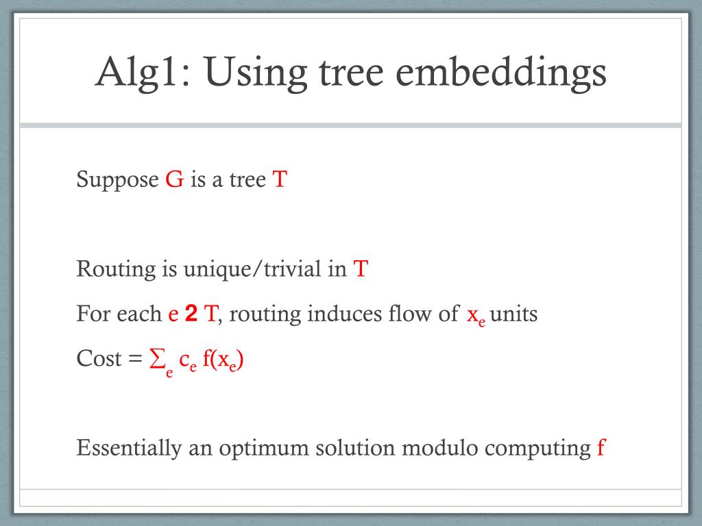 Alg1: Using tree embeddings Suppose G is a tree T Routing is unique/trivial in T For each e 2 T, routing induces flow of xeunits Cost = ecef(xe) Essentially an optimum solution modulo computingf