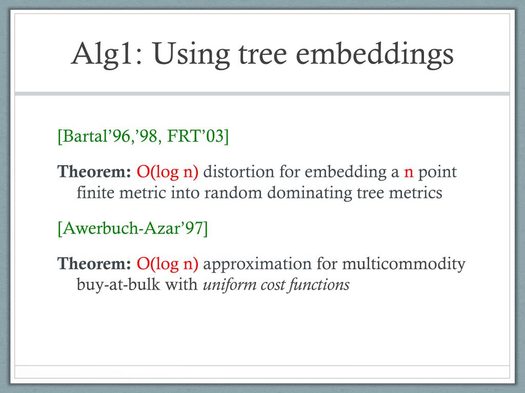 Alg1: Using tree embeddings [Bartal’96,’98, FRT’03] Theorem: O(log n)distortion for embedding a n point finite metric into random dominating tree metrics [Awerbuch-Azar’97] Theorem:O(log n) approximation for multicommodity buy-at-bulk with uniform cost functions