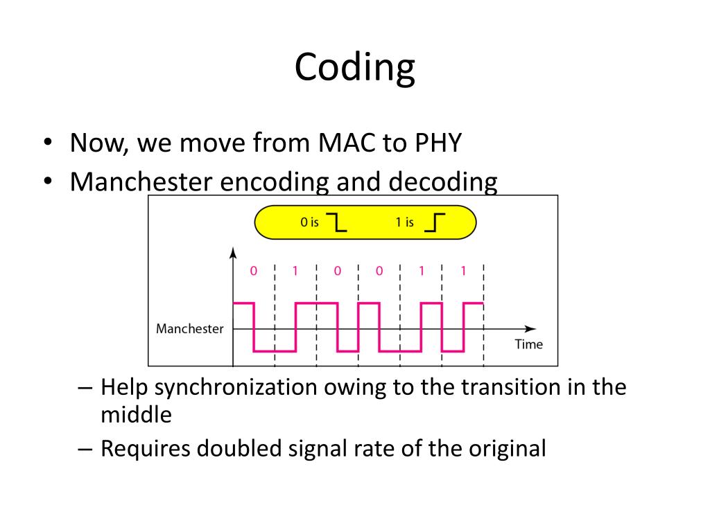 Coding • Now, we move from MAC to PHY • Manchester encoding and decoding • Help synchronization owing to the transition in the middle • Requires doubled signal rate of the original