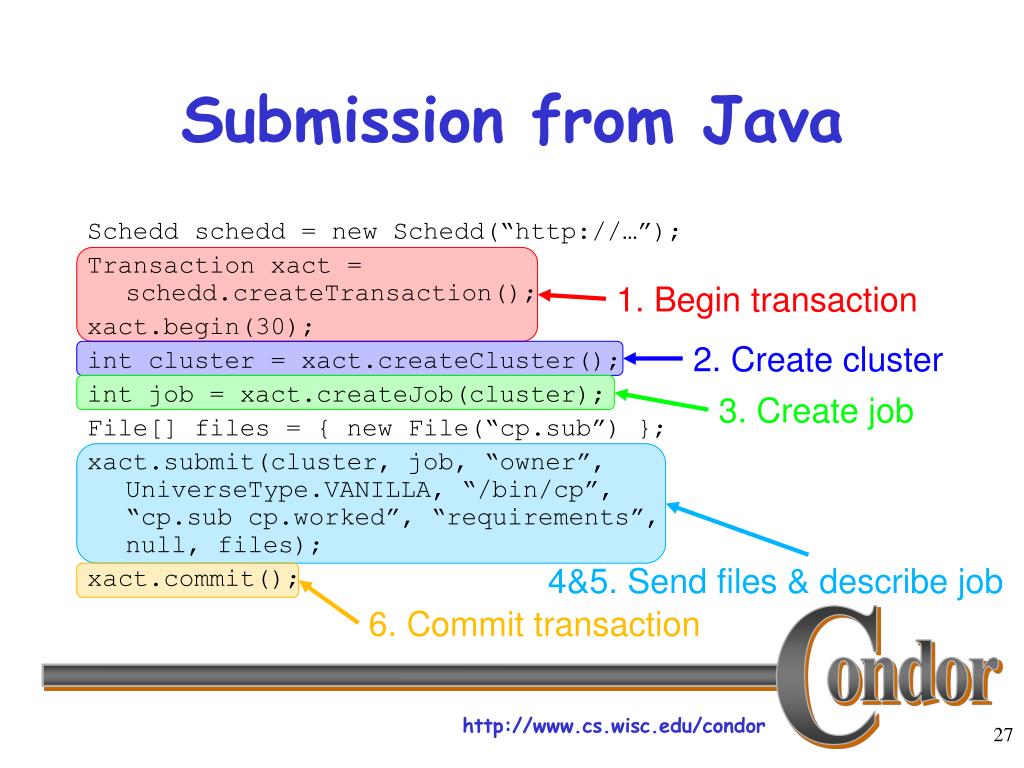 1. Begin transaction 2. Create cluster 3. Create job 4&5. Send files & describe job 6. Commit transaction Submission from Java Schedd schedd = new Schedd(“http://…”); Transaction xact = schedd.createTransaction(); xact.begin(30); int cluster = xact.createCluster(); int job = xact.createJob(cluster); File[] files = { new File(“cp.sub”) }; xact.submit(cluster, job, “owner”, UniverseType.VANILLA, “/bin/cp”, “cp.sub cp.worked”, “requirements”, null, files); xact.commit();