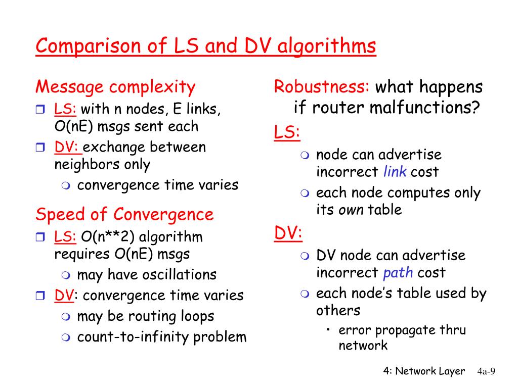 Message complexity LS: with n nodes, E links, O(nE) msgs sent each DV: exchange between neighbors only convergence time varies Speed of Convergence LS: O(n**2) algorithm requires O(nE) msgs may have oscillations DV: convergence time varies may be routing loops count-to-infinity problem Robustness: what happens if router malfunctions? LS: node can advertise incorrect link cost each node computes only its own table DV: DV node can advertise incorrect path cost each node’s table used by others error propagate thru network Comparison of LS and DV algorithms 4: Network Layer