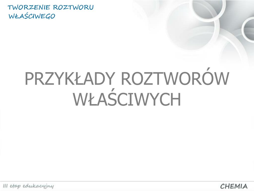 MIESZANINY SUBSTANCJI Z WODĄPodział ze względu na wielkość rozpuszczonej substancji Roztwór właściwy Zawiesina Roztwór koloidalny