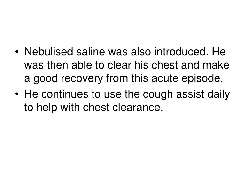Nebulised saline was also introduced. He was then able to clear his chest and make a good recovery from this acute episode. • He continues to use the cough assist daily to help with chest clearance.