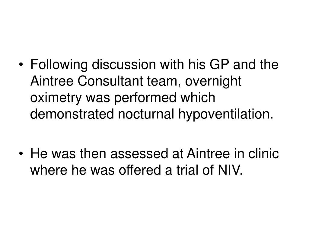 Following discussion with his GP and the Aintree Consultant team, overnight oximetry was performed which demonstrated nocturnal hypoventilation. • He was then assessed at Aintree in clinic where he was offered a trial of NIV.
