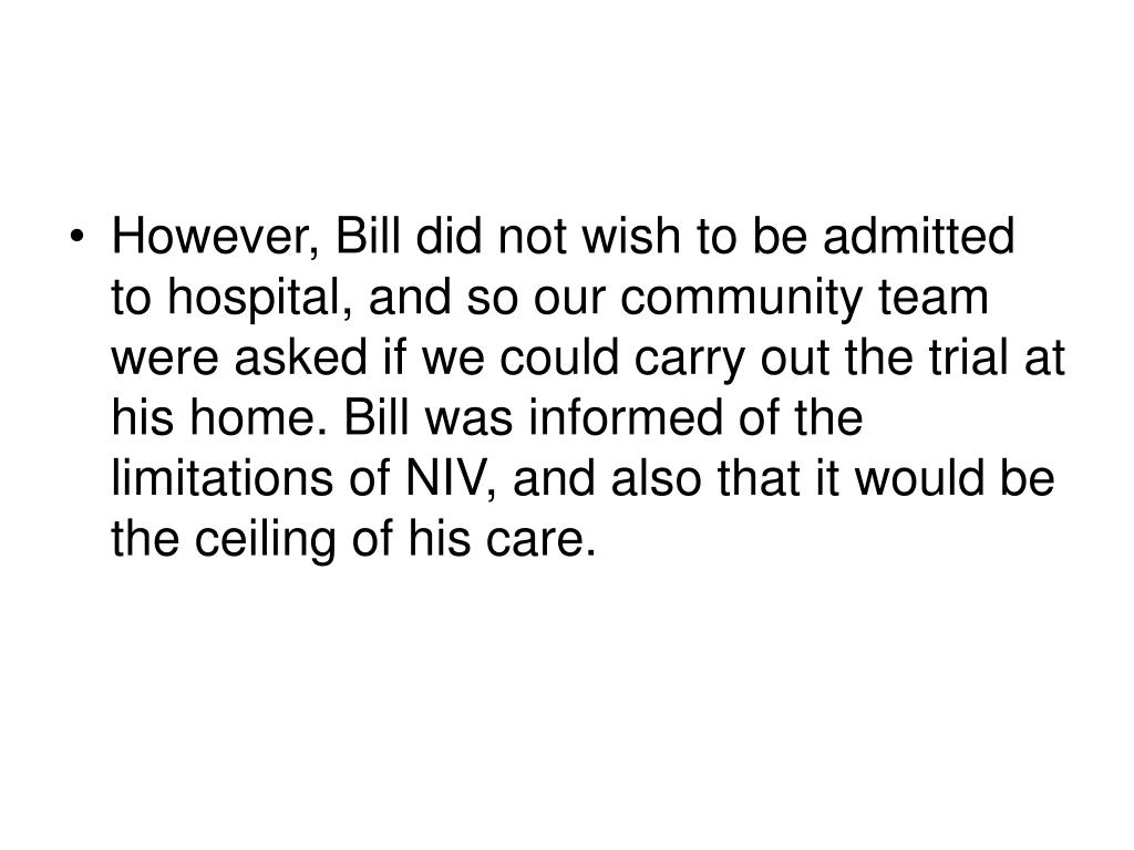However, Bill did not wish to be admitted to hospital, and so our community team were asked if we could carry out the trial at his home. Bill was informed of the limitations of NIV, and also that it would be the ceiling of his care.