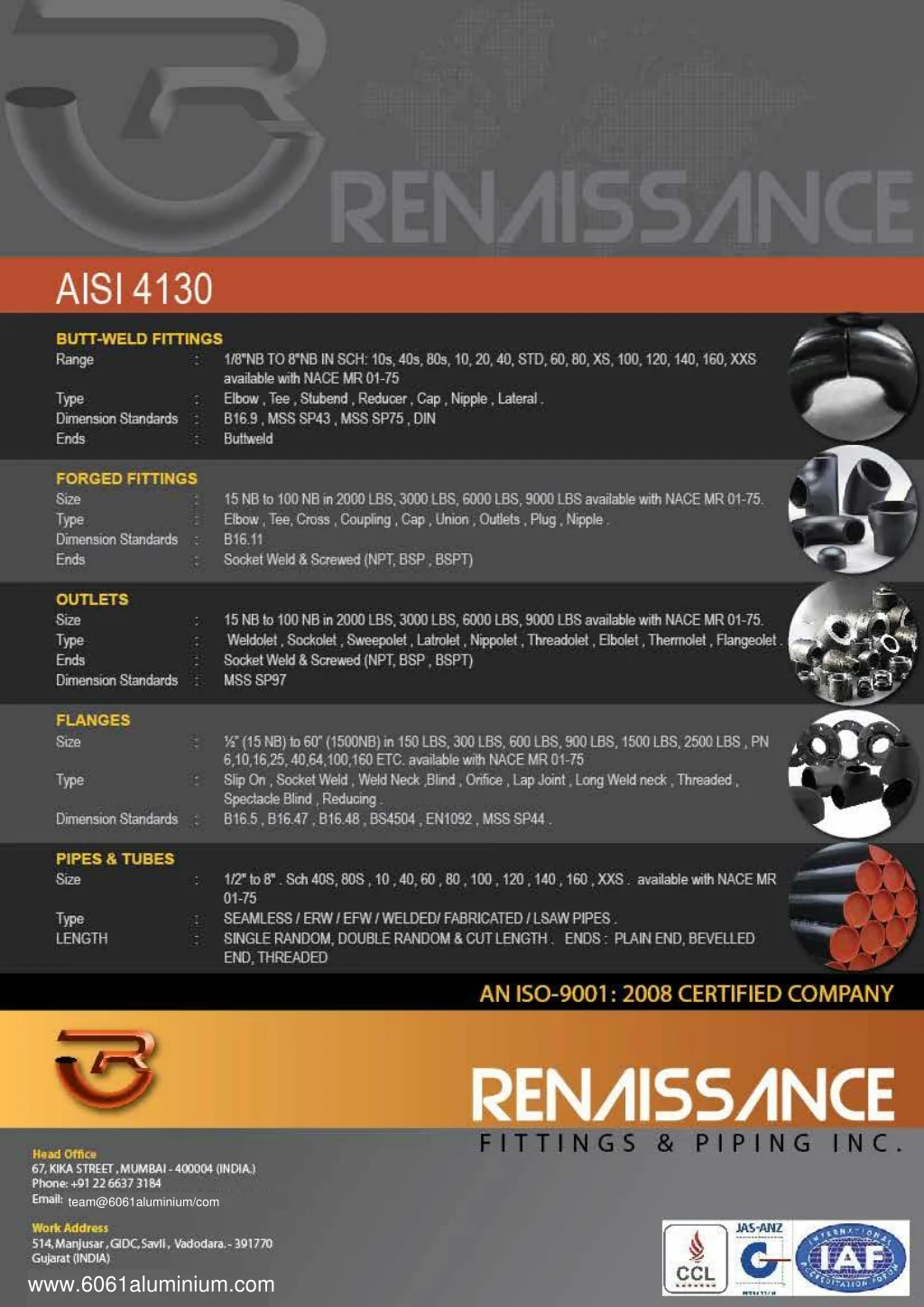Renaissance Fittings and Piping Inc. is your reliable aluminium stockist, supplier, and manufacturer, offering a wide range of products, including aluminium sheets, plates, bars, pipes, tubes, coils, rods, flanges, and fittings. We cater to industries like aerospace, marine, automotive, and construction, providing high-quality aluminium solutions tailored to your needs. Our extensive inventory includes various alloys and tempers, ensuring you get the suitable material for any project.