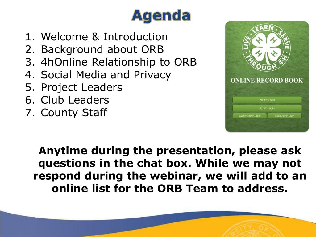 Agenda Welcome & Introduction Background about ORB 4hOnline Relationship to ORB Social Media and Privacy Project Leaders Club Leaders County Staff Anytime during the presentation, please ask questions in the chat box. While we may not respond during the webinar, we will add to an online list for the ORB Team to address.