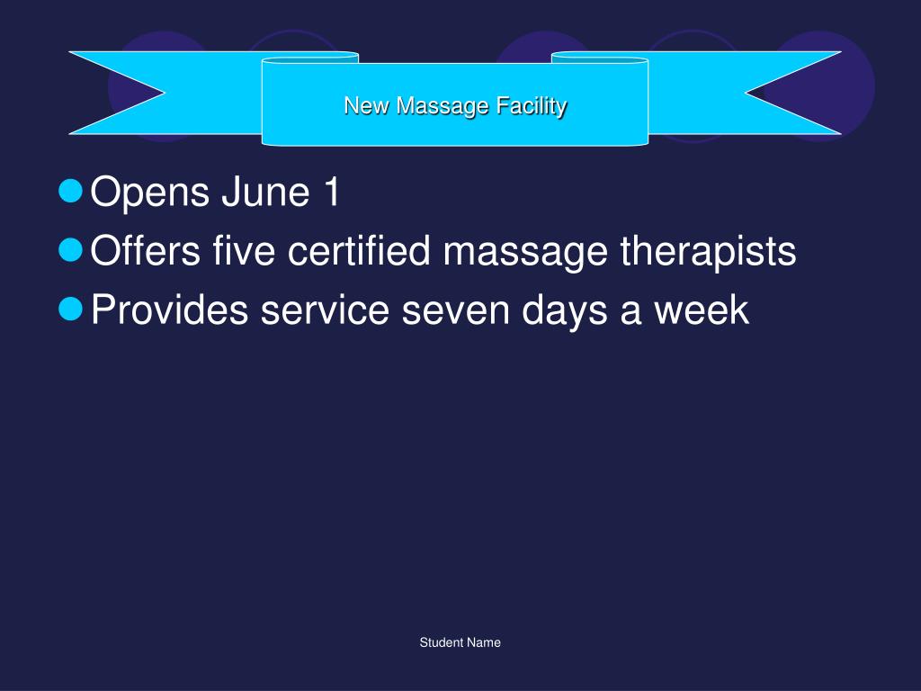 New Massage Facility • Opens June 1 • Offers five certified massage therapists • Provides service seven days a week Student Name