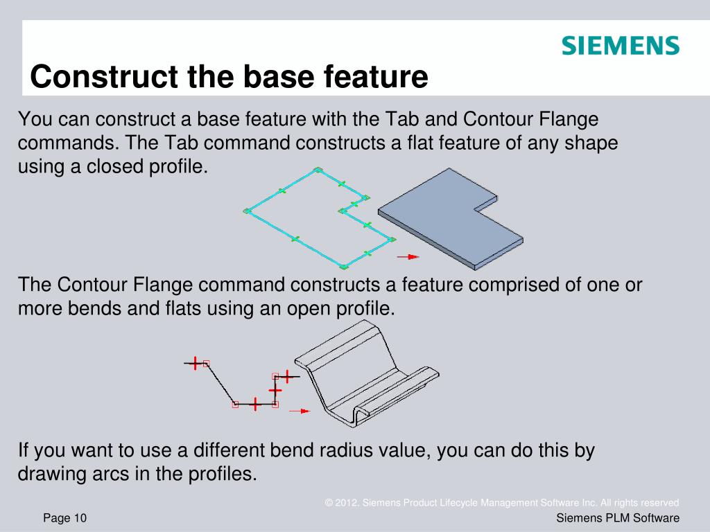 Construct the base feature • You can construct a base feature with the Tab and Contour Flange commands. The Tab command constructs a flat feature of any shape using a closed profile. • The Contour Flange command constructs a feature comprised of one or more bends and flats using an open profile. • If you want to use a different bend radius value, you can do this by drawing arcs in the profiles.