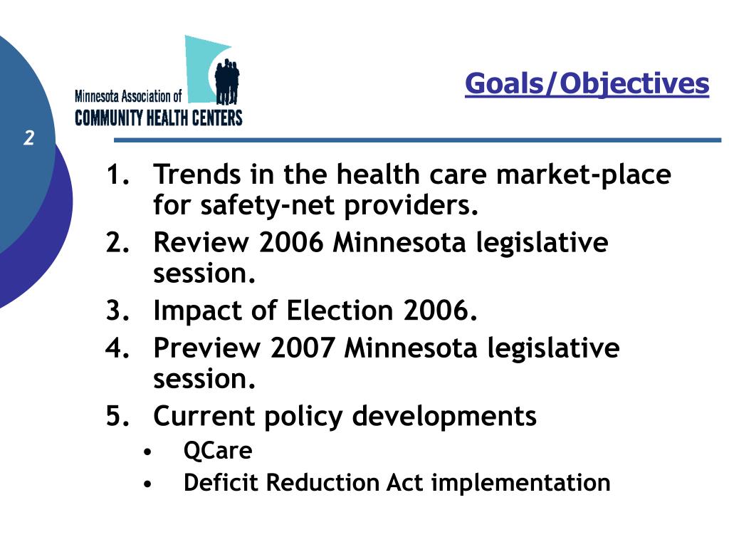 Goals/Objectives • Trends in the health care market-place for safety-net providers. • Review 2006 Minnesota legislative session. • Impact of Election 2006. • Preview 2007 Minnesota legislative session. • Current policy developments • QCare • Deficit Reduction Act implementation