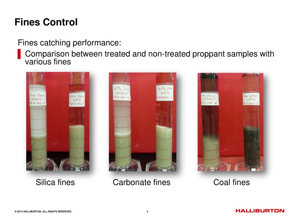Fines Control Fines catching performance: • Comparison between treated and non-treated proppant samples with various fines Silica fines Carbonate fines Coal fines