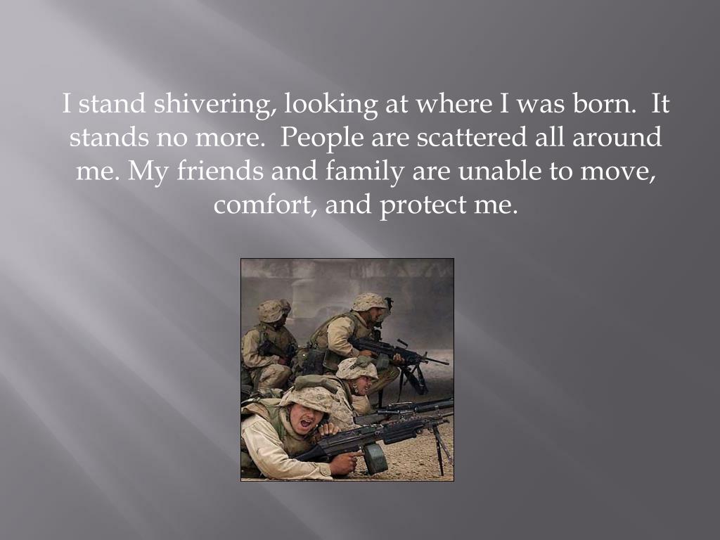 I stand shivering, looking at where I was born. It stands no more. People are scattered all around me. My friends and family are unable to move, comfort, and protect me.