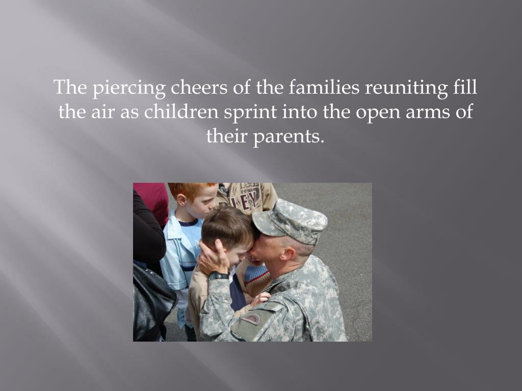 The piercing cheers of the families reuniting fill the air as children sprint into the open arms of their parents.