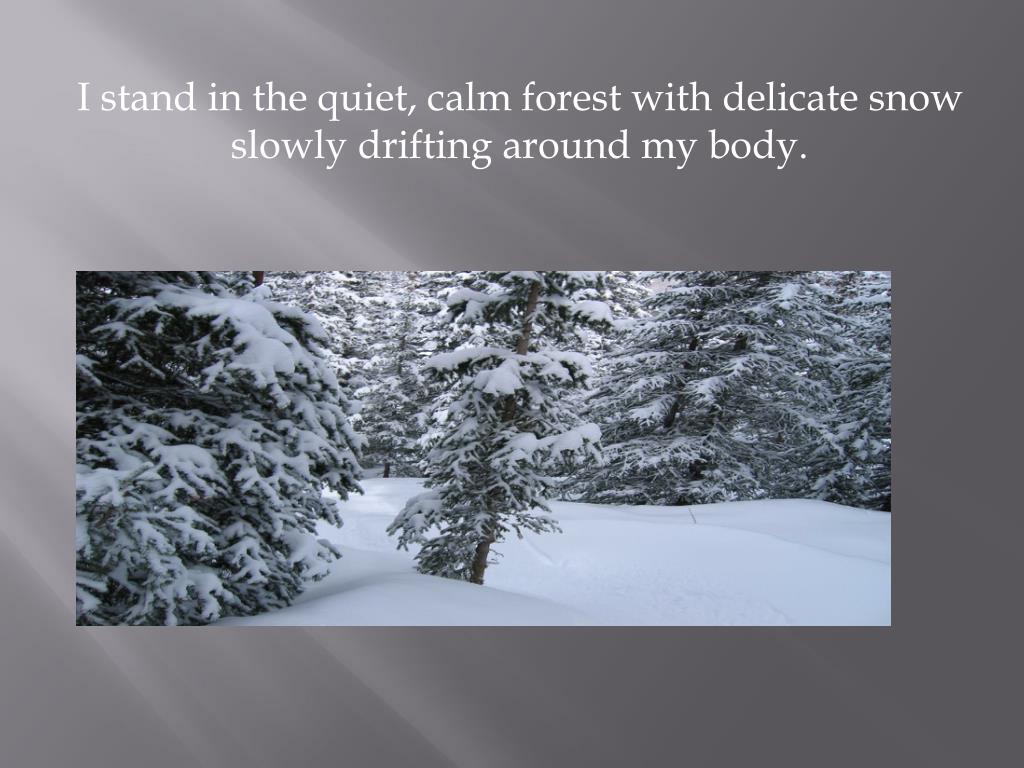 I stand in the quiet, calm forest with delicate snow slowly drifting around my body.