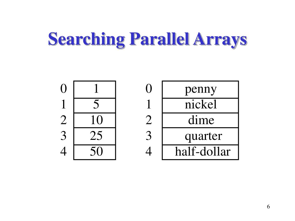 Searching Parallel Arrays 0 1 0 penny 1 5 1 nickel 2 10 2 dime 3 25 3 quarter 4 50 4 half-dollar