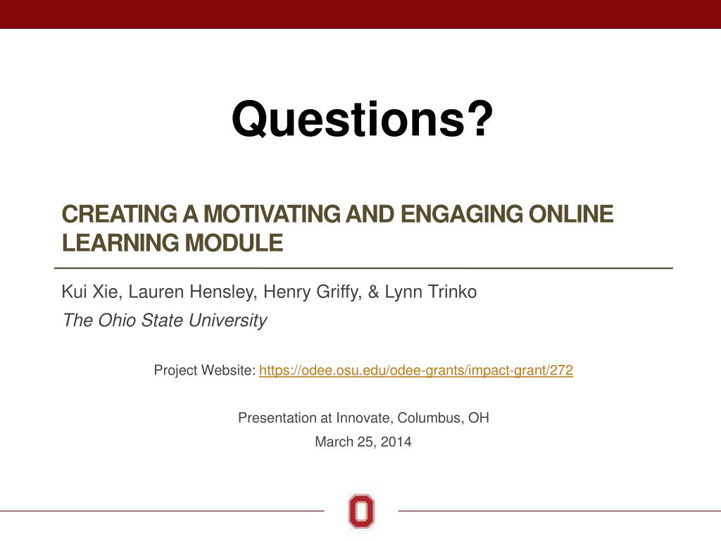 Questions? Creating a motivATing and engaging online learning module Kui Xie,Lauren Hensley, Henry Griffy, & Lynn Trinko The Ohio State University Project Website: https://odee.osu.edu/odee-grants/impact-grant/272 Presentation at Innovate, Columbus, OH March 25, 2014