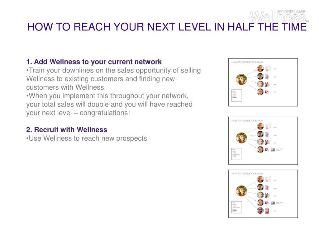 Prospecting with Wellness... HOW TO REACH YOUR NEXT LEVEL IN HALF THE TIME • 1. Add Wellness to your current network • Train your downlines on the sales opportunity of selling Wellness to existing customers and finding new customers with Wellness • When you implement this throughout your network, your total sales will double and you will have reached your next level – congratulations! • 2. Recruit with Wellness • Use Wellness to reach new prospects