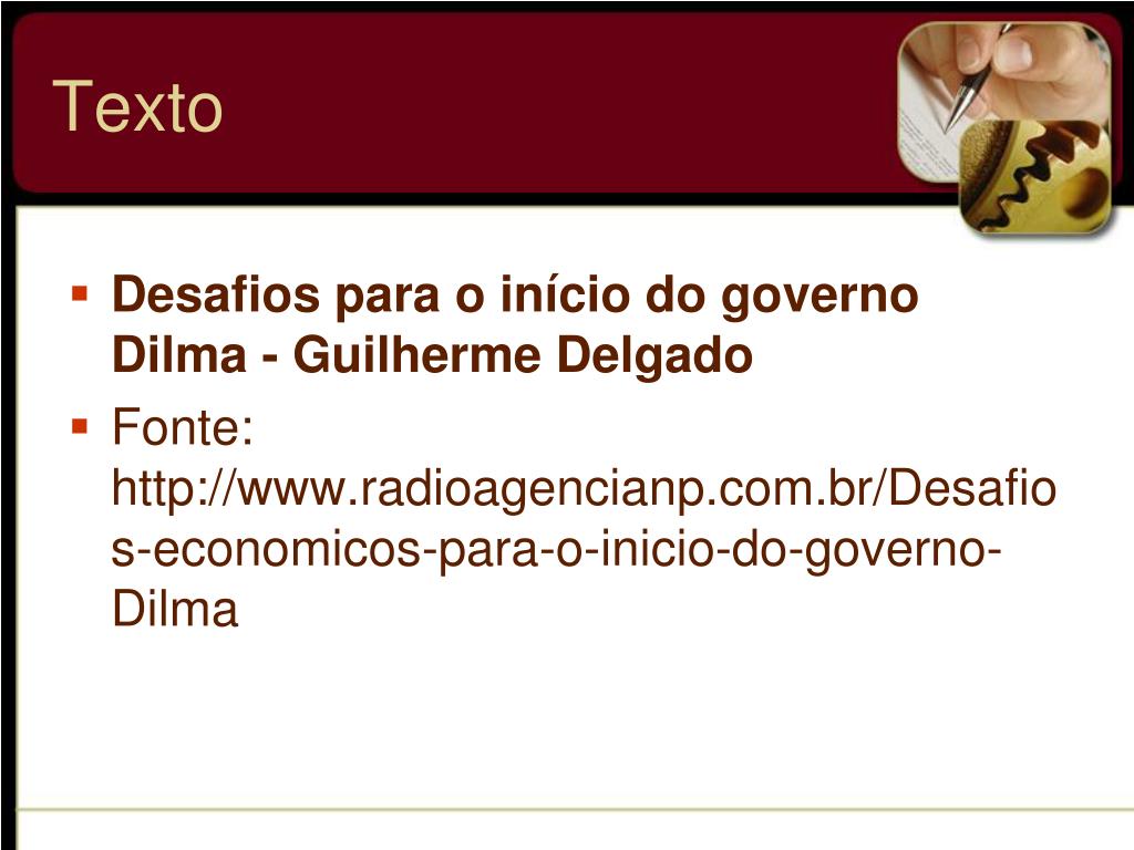 Texto • Desafios para o início do governo Dilma - Guilherme Delgado • Fonte: http://www.radioagencianp.com.br/Desafios-economicos-para-o-inicio-do-governo-Dilma