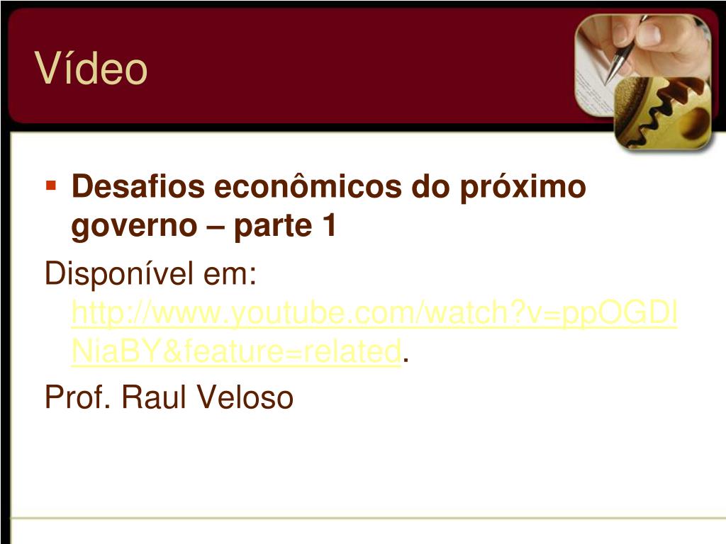 Vídeo • Desafios econômicos do próximo governo – parte 1 Disponível em: http://www.youtube.com/watch?v=ppOGDlNiaBY&feature=related. Prof. Raul Veloso