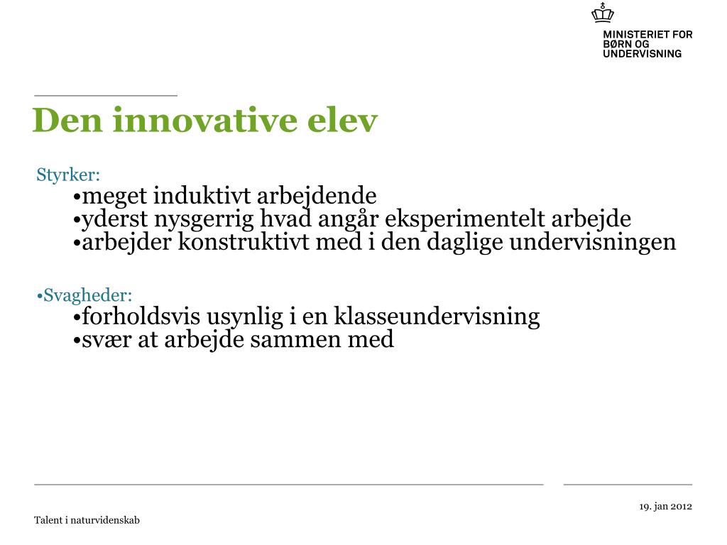Den innovative elev Styrker: meget induktivt arbejdende yderst nysgerrig hvad angår eksperimentelt arbejde arbejder konstruktivt med i den daglige undervisningen Svagheder: forholdsvis usynlig i en klasseundervisning svær at arbejde sammen med Talent i naturvidenskab