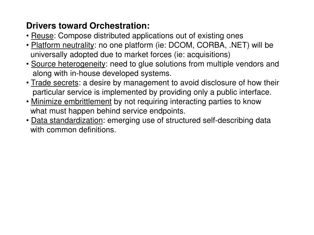 Drivers toward Orchestration: • Reuse: Compose distributed applications out of existing ones • Platform neutrality: no one platform (ie: DCOM, CORBA, .NET) will be • universally adopted due to market forces (ie: acquisitions)