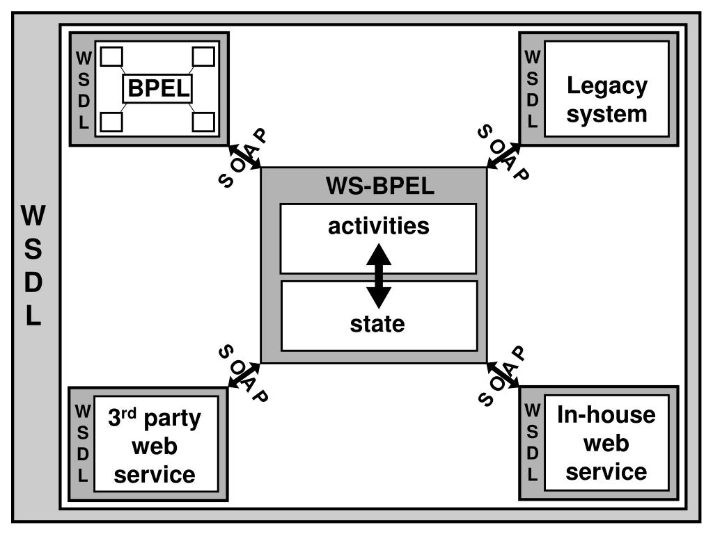 W S D L W S D L Legacy system BPEL S O A P S O A P WS-BPEL W S D L activities state S O A P S O A P W S D L In-house web service W S D L 3rd party web service