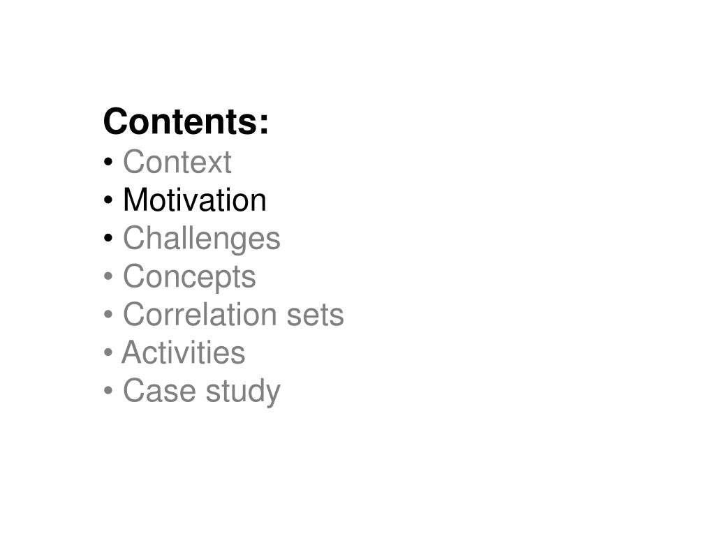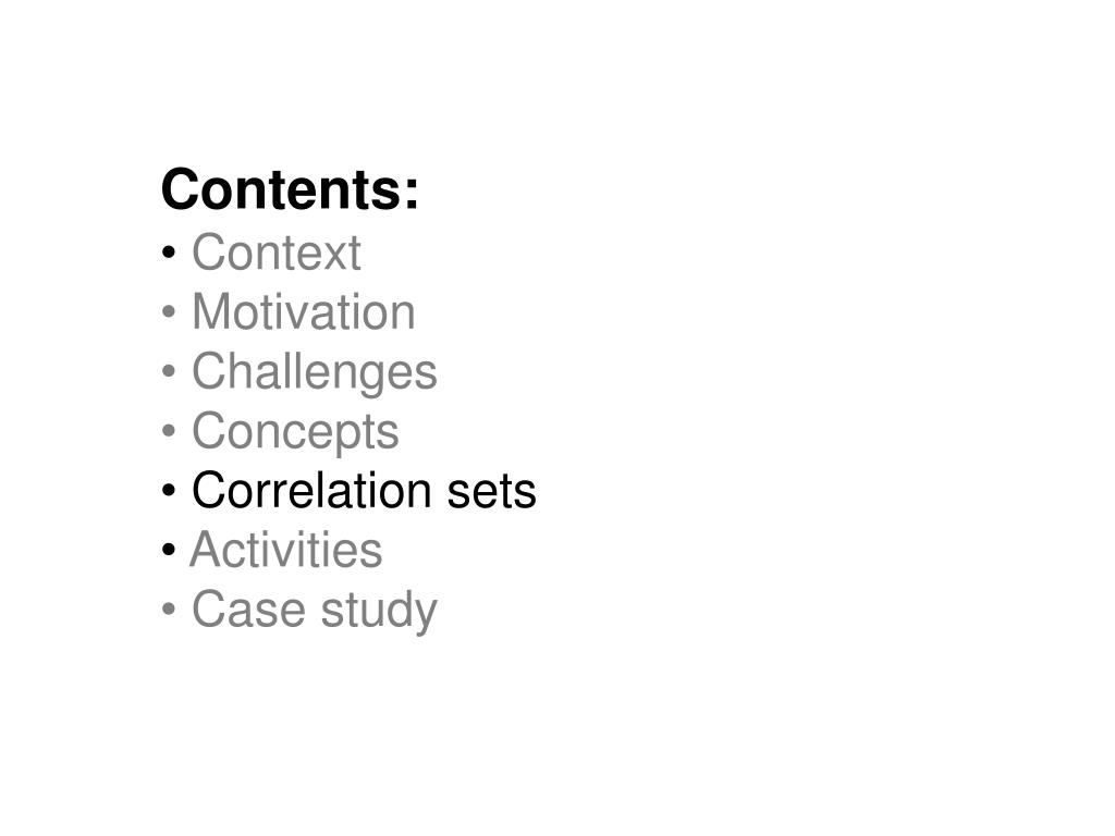 Contents: • Context • Motivation • Challenges • Concepts • Correlation sets • Activities • Case study