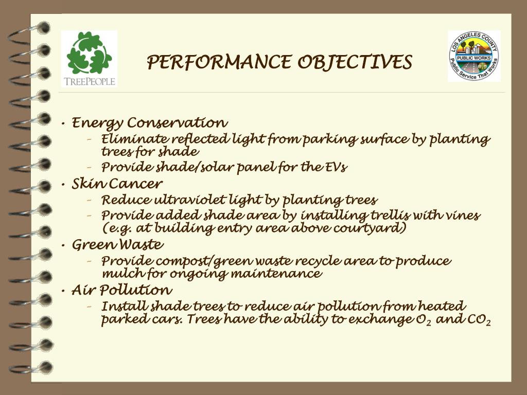 PERFORMANCE OBJECTIVES • Energy Conservation • Eliminate reflected light from parking surface by planting trees for shade • Provide shade/solar panel for the EVs • Skin Cancer • Reduce ultraviolet light by planting trees • Provide added shade area by installing trellis with vines (e.g. at building entry area above courtyard) • Green Waste • Provide compost/green waste recycle area to produce mulch for ongoing maintenance • Air Pollution • Install shade trees to reduce air pollution from heated parked cars. Trees have the ability to exchange O2 and CO2