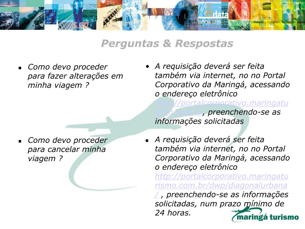Perguntas & Respostas • A requisição deverá ser feita também via internet, no no Portal Corporativo da Maringá, acessando o endereço eletrônico http://portalcorporativo.maringatuismo.com.br, preenchendo-se as informações solicitadas • A requisição deverá ser feita também via internet, no no Portal Corporativo da Maringá, acessando o endereço eletrônico http://portalcorporativo.maringaturismo.com.br/dwp/diagonalurbana/, preenchendo-se as informações solicitadas, num prazo mínimo de 24 horas. • Como devo proceder para fazer alterações em minha viagem ? • Como devo proceder para cancelar minha viagem ?