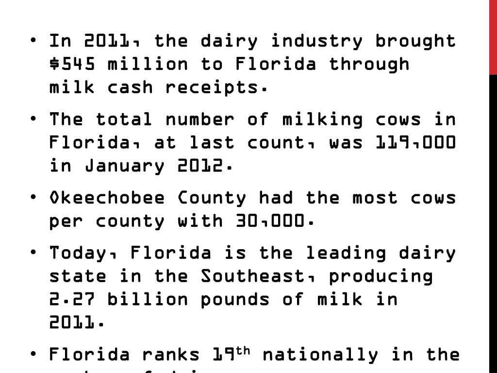 In 2011, the dairy industry brought $545 million to Florida through milk cash receipts. • The total number of milking cows in Florida, at last count, was 119,000 in January 2012. • Okeechobee County had the most cows per county with 30,000. • Today, Florida is the leading dairy state in the Southeast, producing 2.27 billion pounds of milk in 2011. • Florida ranks 19th nationally in the number of dairy cows.