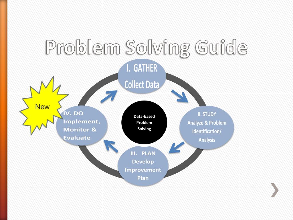 I. GATHER Collect Data Data-based Problem Solving IV. DO Implement, Monitor & Evaluate II. STUDY Analyze & Problem Identification/ Analysis III. PLAN Develop Improvement Plan Problem Solving Guide