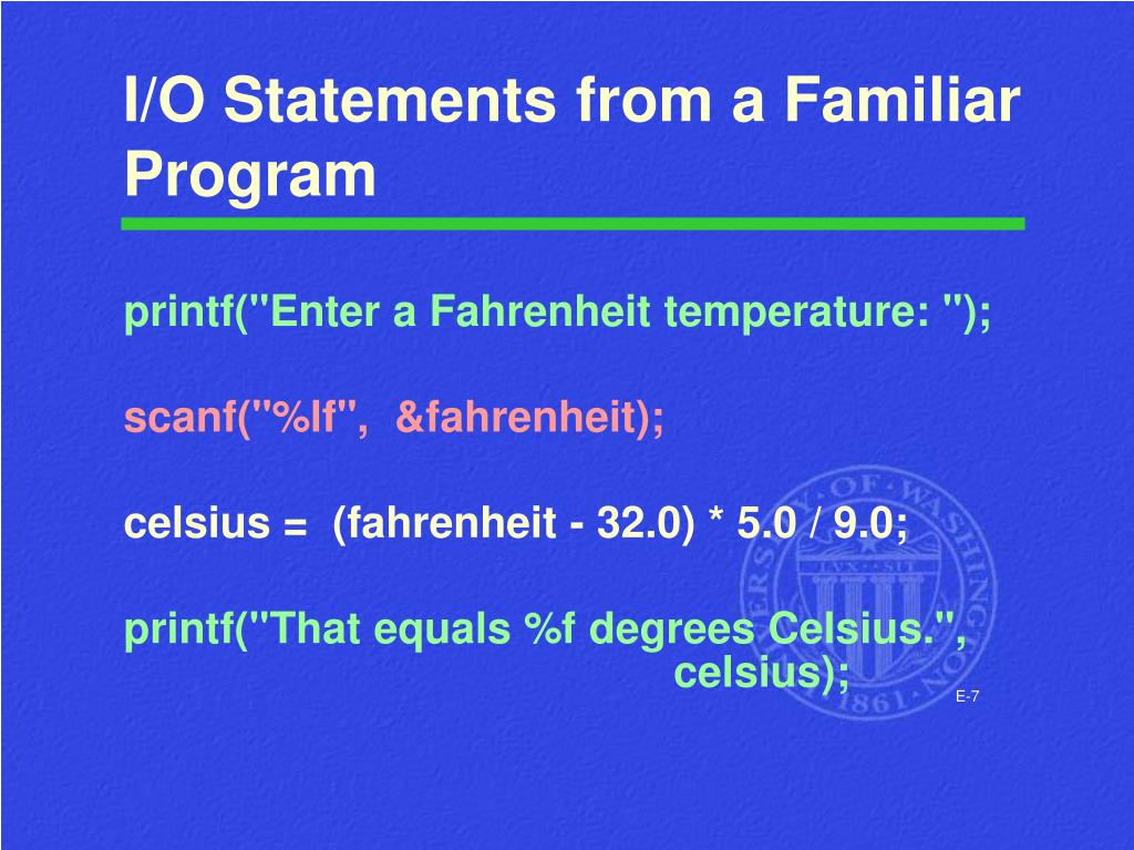 I/O Statements from a Familiar Program • printf("Enter a Fahrenheit temperature: "); • scanf("%lf", &fahrenheit); • celsius = (fahrenheit - 32.0) * 5.0 / 9.0; • printf("That equals %f degrees Celsius.", celsius);