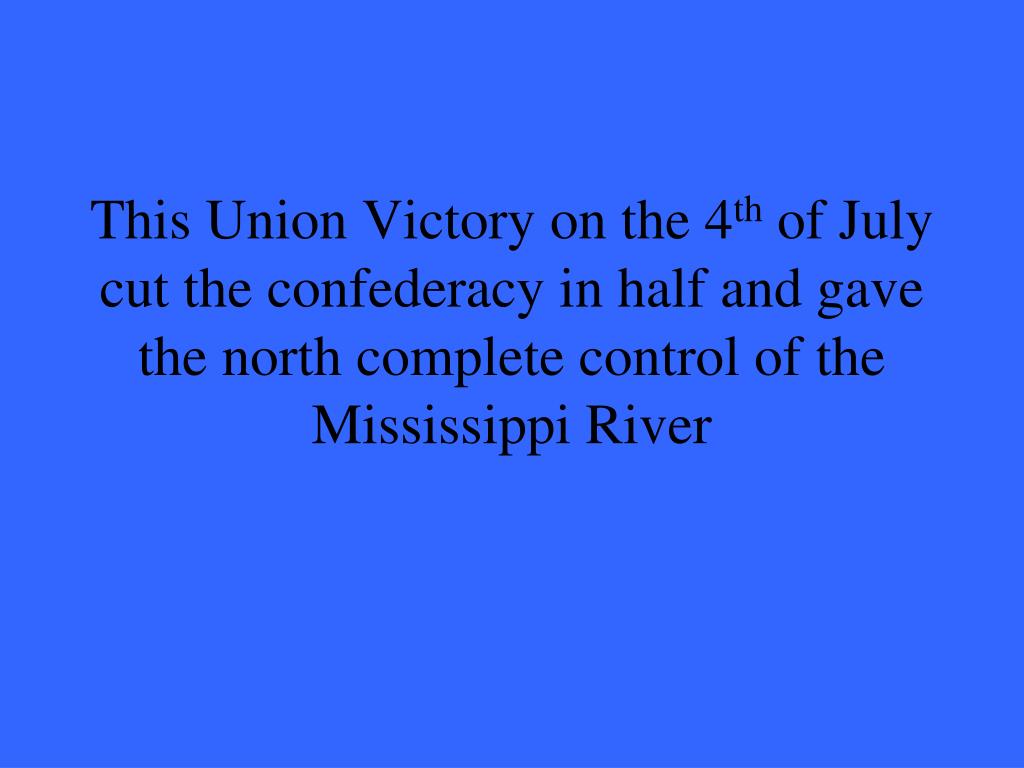 This Union Victory on the 4th of July cut the confederacy in half and gave the north complete control of the Mississippi River
