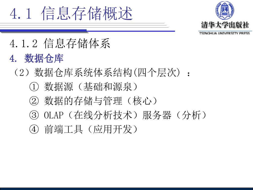 4.1 信息存储概述 4.1.2 信息存储体系 4. 数据仓库 (2)数据仓库系统体系结构(四个层次) : ① 数据源(基础和源泉) ② 数据的存储与管理(核心) ③ OLAP(在线分析技术)服务器(分析) ④ 前端工具(应用开发)