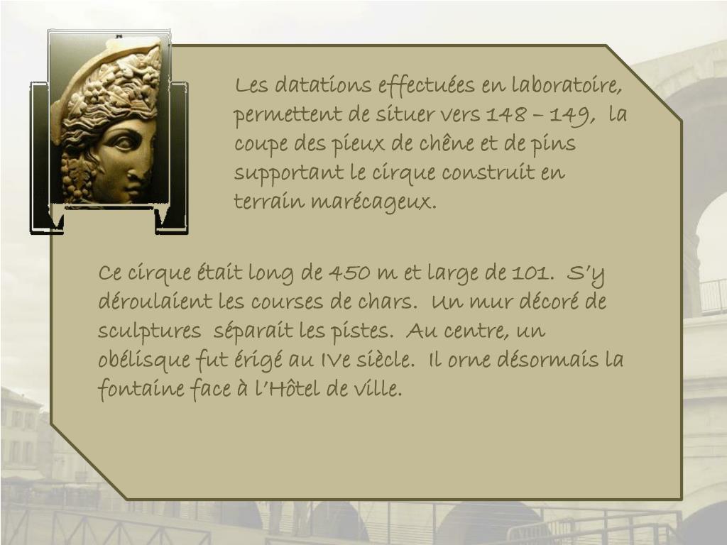 Les datations effectuées en laboratoire, permettent de situer vers 148 – 149, la coupe des pieux de chêne et de pins supportant le cirque construit en terrain marécageux. Ce cirque était long de 450 m et large de 101. S’y déroulaient les courses de chars. Un mur décoré de sculptures séparait les pistes. Au centre, un obélisque fut érigé au IVe siècle. Il orne désormais la fontaine face à l’Hôtel de ville.