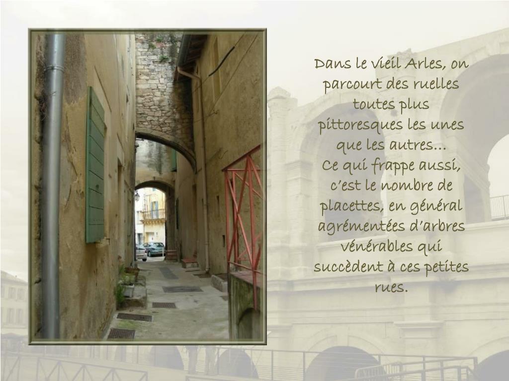 Dans le vieil Arles, on parcourt des ruelles toutes plus pittoresques les unes que les autres… Ce qui frappe aussi, c’est le nombre de placettes, en général agrémentées d’arbres vénérables qui succèdent à ces petites rues.