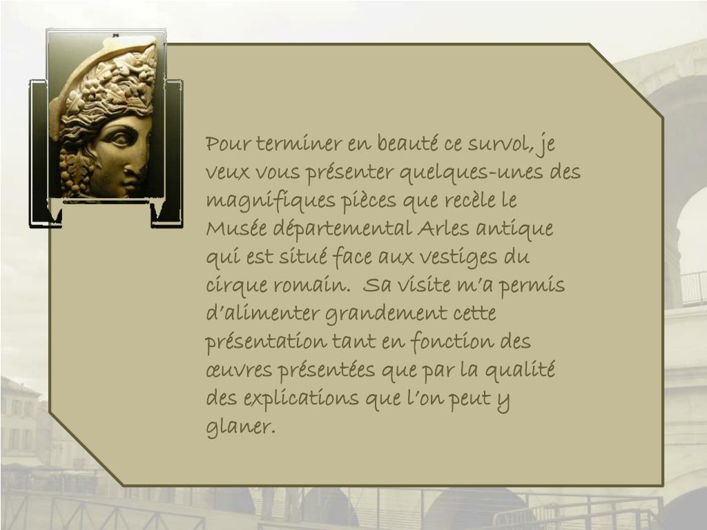 Pour terminer en beauté ce survol, je veux vous présenter quelques-unes des magnifiques pièces que recèle le Musée départemental Arles antique qui est situé face aux vestiges du cirque romain. Sa visite m’a permis d’alimenter grandement cette présentation tant en fonction des œuvres présentées que par la qualité des explications que l’on peut y glaner.