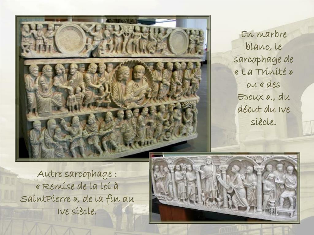 En marbre blanc, le sarcophage de « La Trinité » ou « des Epoux »., du début du Ive siècle. Autre sarcophage : « Remise de la loi à SaintPierre », de la fin du Ive siècle.