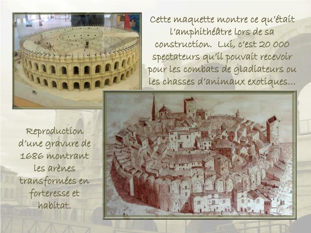Cette maquette montre ce qu’était l’amphithéâtre lors de sa construction. Lui, c’est 20 000 spectateurs qu’il pouvait recevoir pour les combats de gladiateurs ou les chasses d’animaux exotiques… Reproduction d’une gravure de 1686 montrant les arènes transformées en forteresse et habitat.