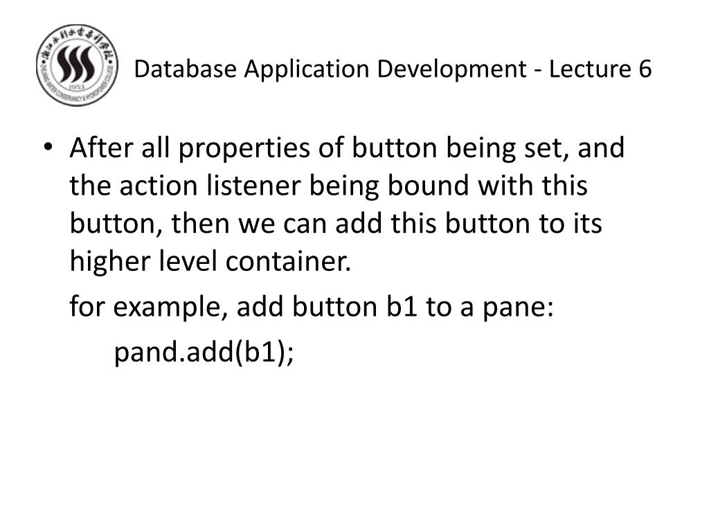 Database Application Development - Lecture 6 • After all properties of button being set, and the action listener being bound with this button, then we can add this button to its higher level container. for example, add button b1 to a pane: pand.add(b1);