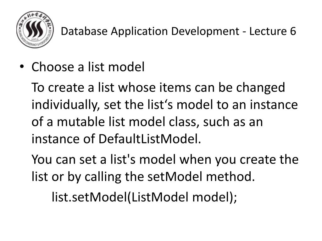 Database Application Development - Lecture 6 • Choose a list model To create a list whose items can be changed individually, set the list‘s model to an instance of a mutable list model class, such as an instance of DefaultListModel. You can set a list's model when you create the list or by calling the setModel method. list.setModel(ListModel model);