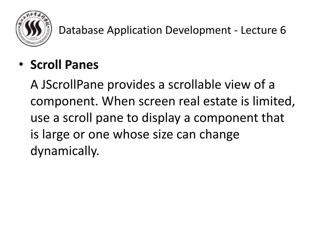 Database Application Development - Lecture 6 • Scroll Panes A JScrollPane provides a scrollable view of a component. When screen real estate is limited, use a scroll pane to display a component that is large or one whose size can change dynamically.
