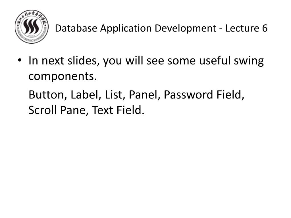 Database Application Development - Lecture 6 • In next slides, you will see some useful swing components. Button, Label, List, Panel, Password Field, Scroll Pane, Text Field.
